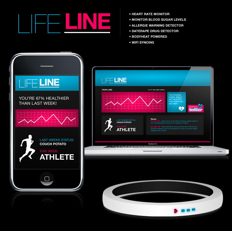 LifeLine is a health tracking system that uses a bracelet to monitor a person’s heart rate, blood sugar levels, body temperature, and wirelessly sync the users information to their mobile or home PC. LifeLine will creategraphs with the data it collects and encourages the user to stay active by supplying week to week feedback. The bracelet is powered by body heat, by usb cable, or a wireless power pad. All data can be shared via social media using LifeLine’s dedicated app or website to encourage competitive challenges with others.